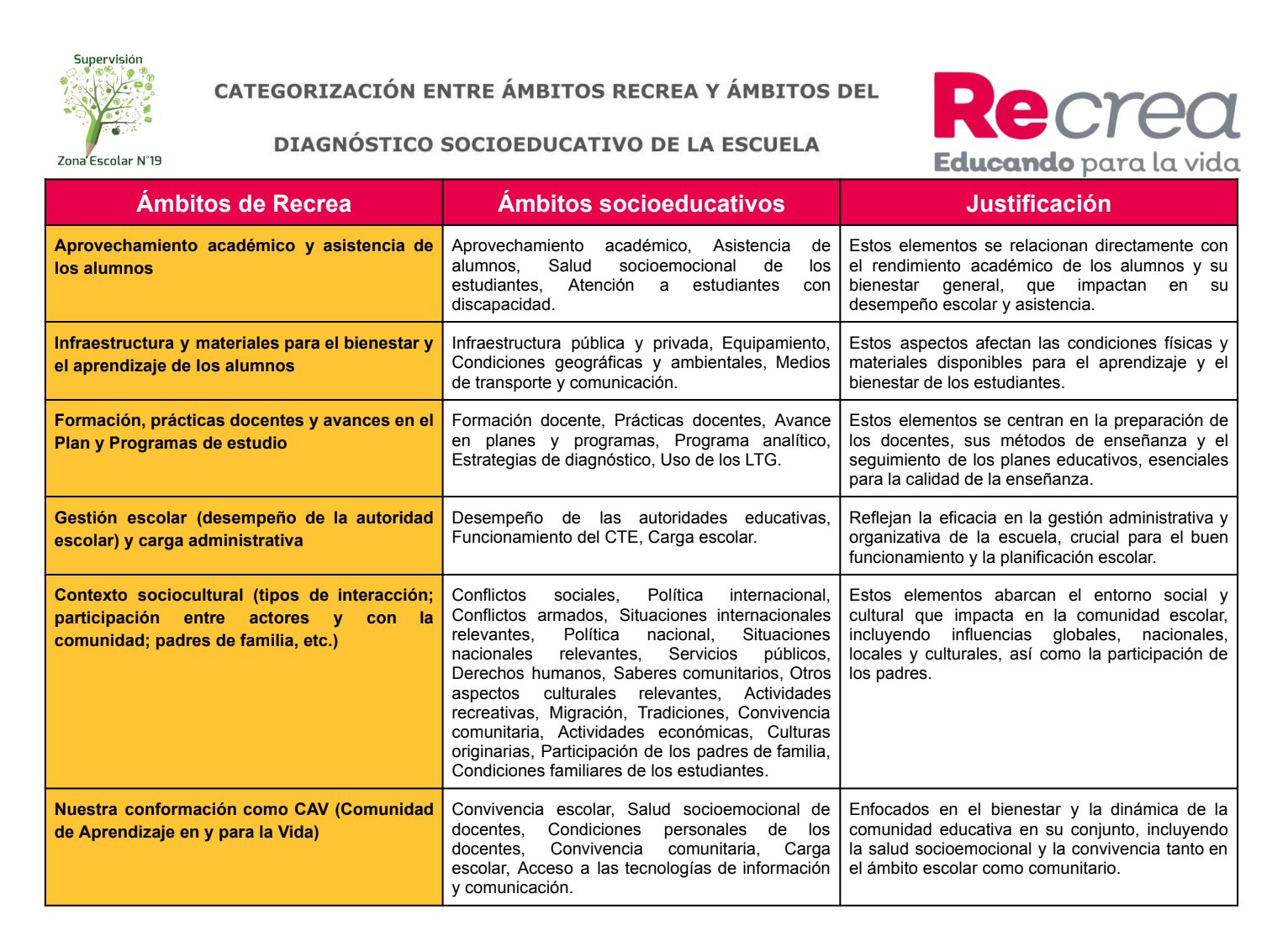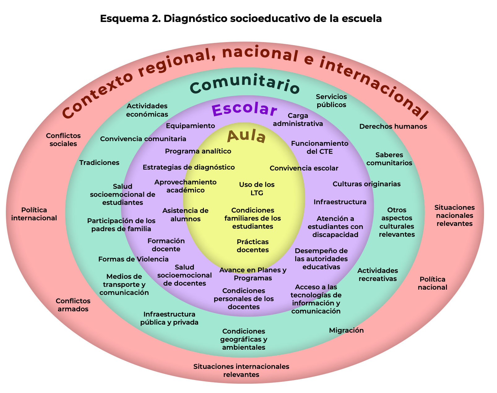 - Diagnóstico Socioeducativo: Realizar una lectura de la realidad desde diferentes ámbitos para ubicar los aspectos sociales, culturales, pedagógicos, organizativos, administrativos y de gestión que requieren la intervención de los actores de la comunidad escolar y de acciones específicas para su mejora.
